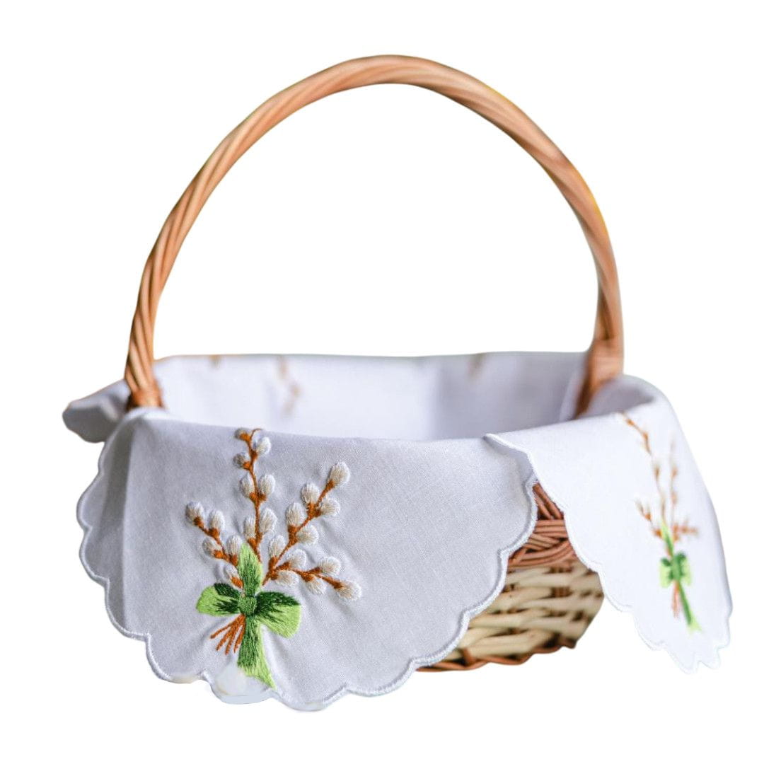 Serwetka posiada cztery dekoracyjne płaty, które efektownie układają się poza koszyczkiem. Każdy z nich ozdobiony jest ręcznie wykonanym haftem bazi przewiązanych zielonymi wstążkami – motywem symbolicznym, delikatnym i wiosennym.