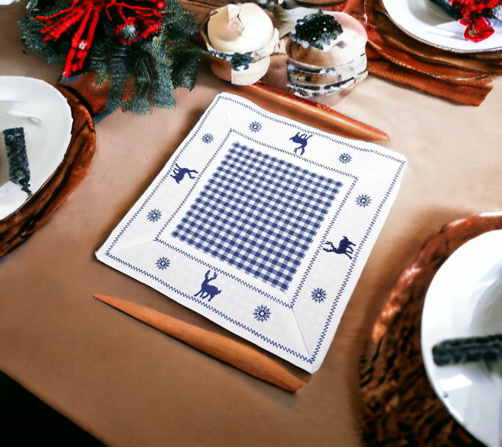 Urocza serwetka stanowi doskonałe wykończenie świątecznego stołu, dodając radosnego uroku i charakteru. Wykonana z wysokiej jakości poliestru, kwadratowa serwetka o wymiarach 30x30 prezentuje delikatny, lecz uderzający niebieski motyw ze świątecznym wzorem reniferów. To idealny dodatek, który wplecie nutę świątecznej magii do Twojego wystroju stołu.
