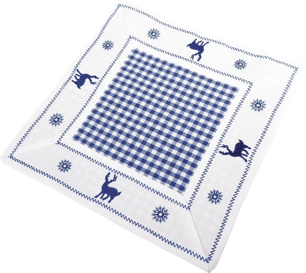 Kwadratowa serwetka z niebieskim motywem świątecznym reniferów.