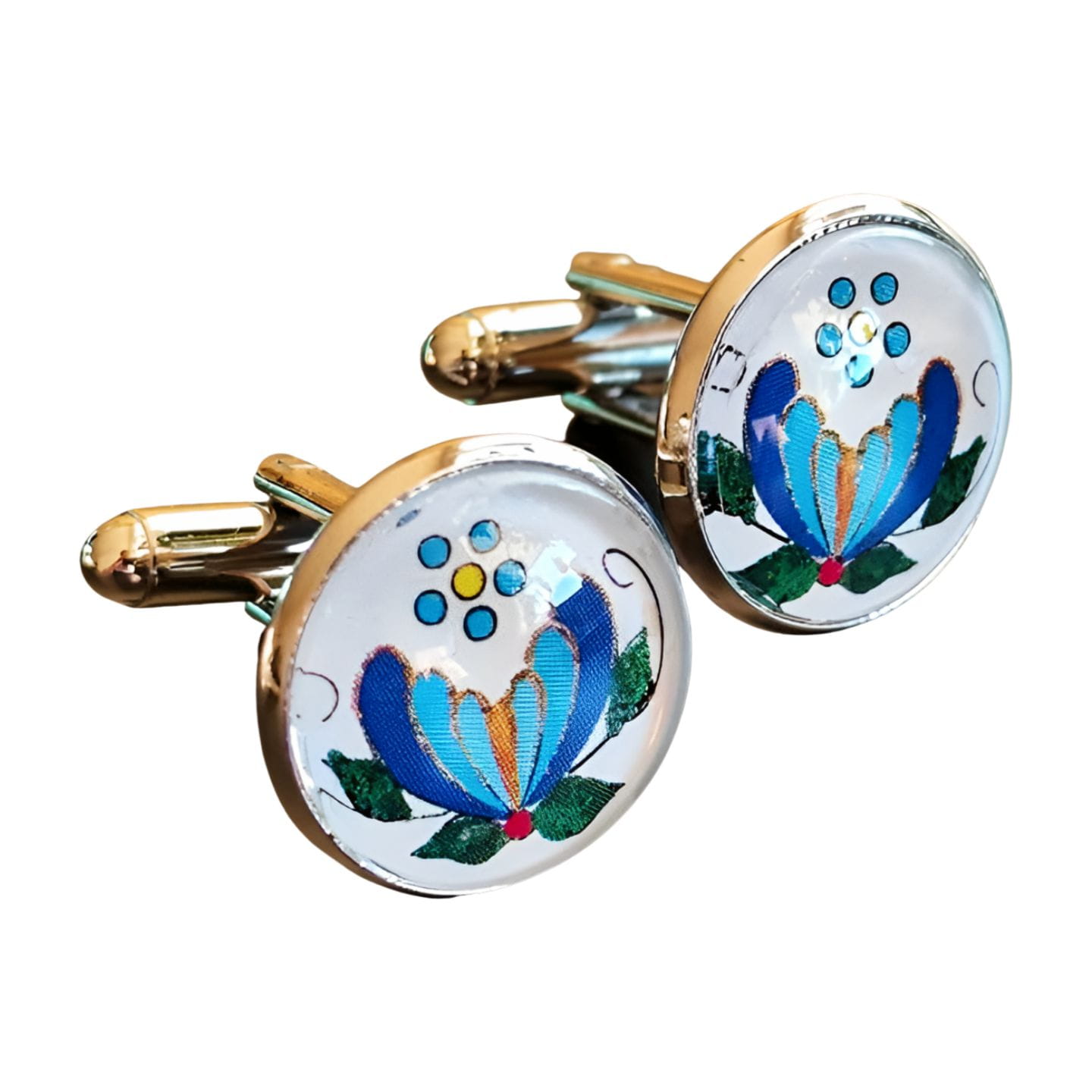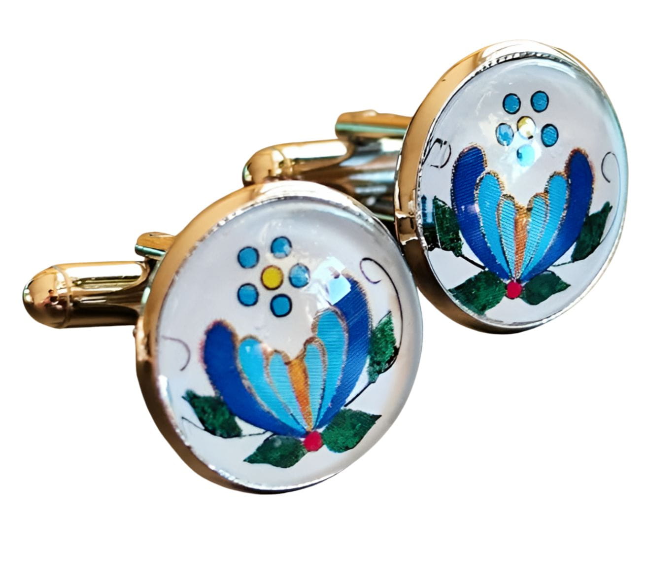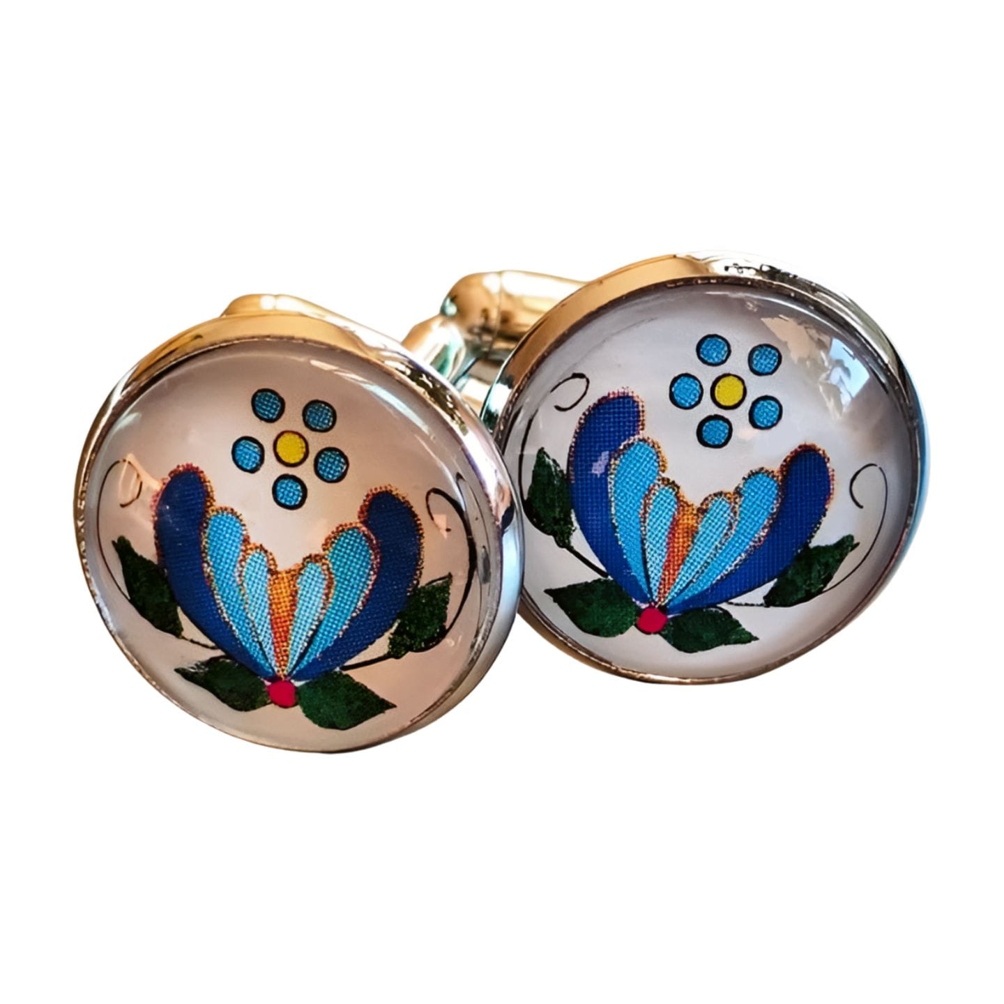 Na tle jasnej bazy pięknie prezentuje się wielobarwny kwiat z niebieskimi, zielonymi i żółtymi akcentami, który został starannie odwzorowany w formie graficznej. Spinki są wygodne w użyciu, solidnie wykonane i stanowią wyjątkowy dodatek do każdej eleganckiej koszuli. Wymiary: średnica oczka: 1,6 cm | długość całkowita: 2 cm