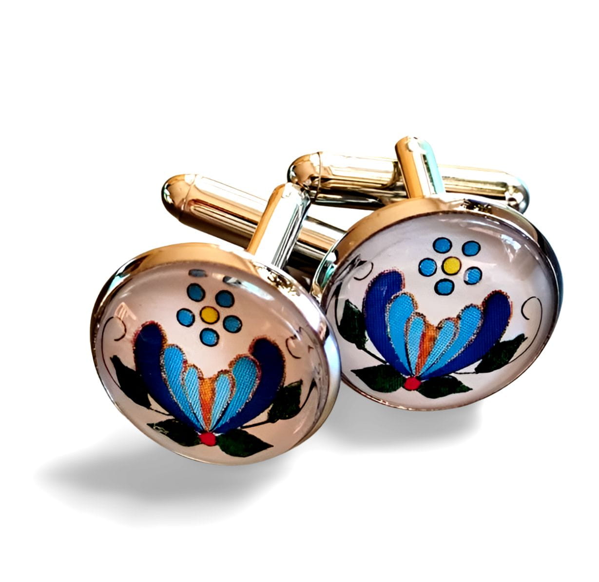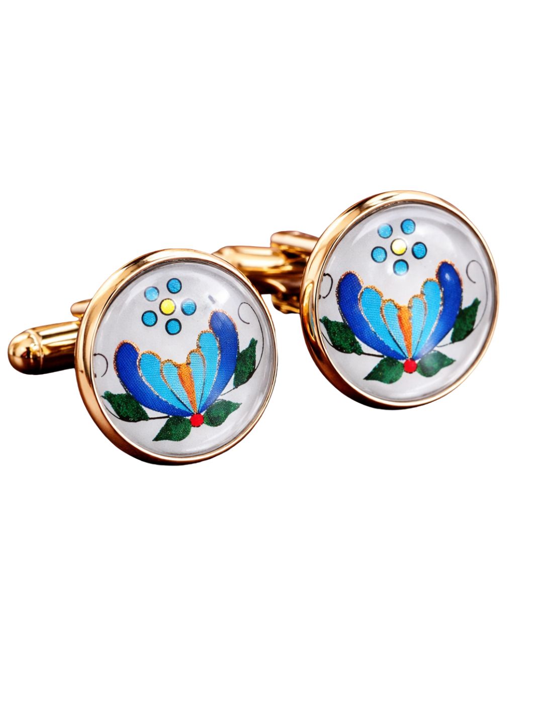 Spinki do mankietów „Kaszubska Palmeta” to połączenie tradycji i wyrafinowania. Wzór inspirowany klasycznym haftem kaszubskim – kwiat palmeta – symbolizuje rozwój, życie i równowagę. Zamknięty pod wypukłą szklaną soczewką, zyskuje głębię i szlachetny połysk, tworząc efektowne oczko spinki.