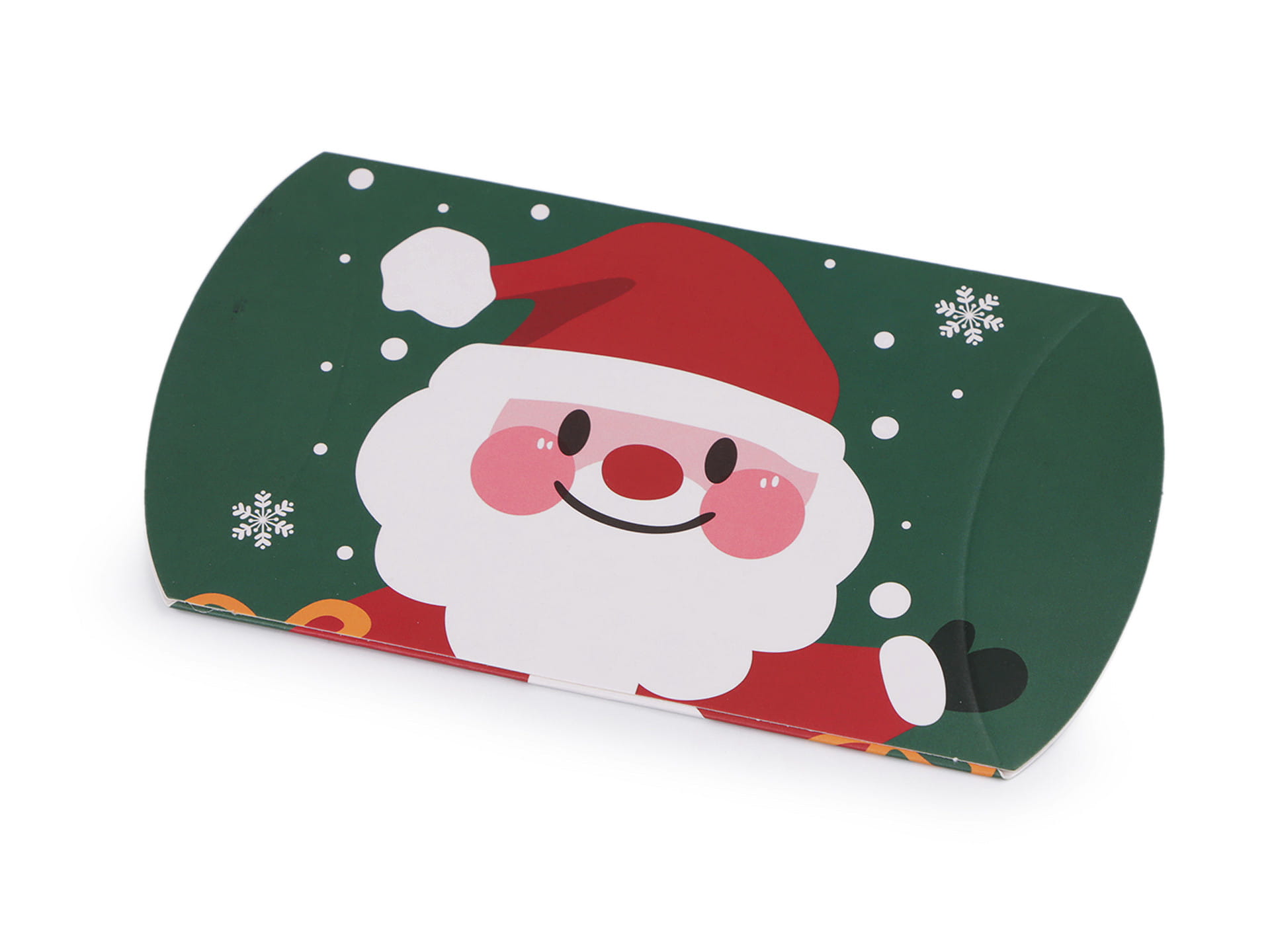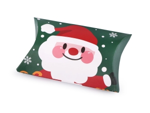 Kształt: poduszka Motyw: Święty Mikołaj na zielonym tle Wymiary po złożeniu: 7,5 × 12 × 2,8 cm Wymiary rozłożonego pudełka: 8 × 14,3 cm Materiał: karton z kolorowym nadrukiem Przeznaczenie: drobne upominki, biżuteria, słodycze (w woreczku)