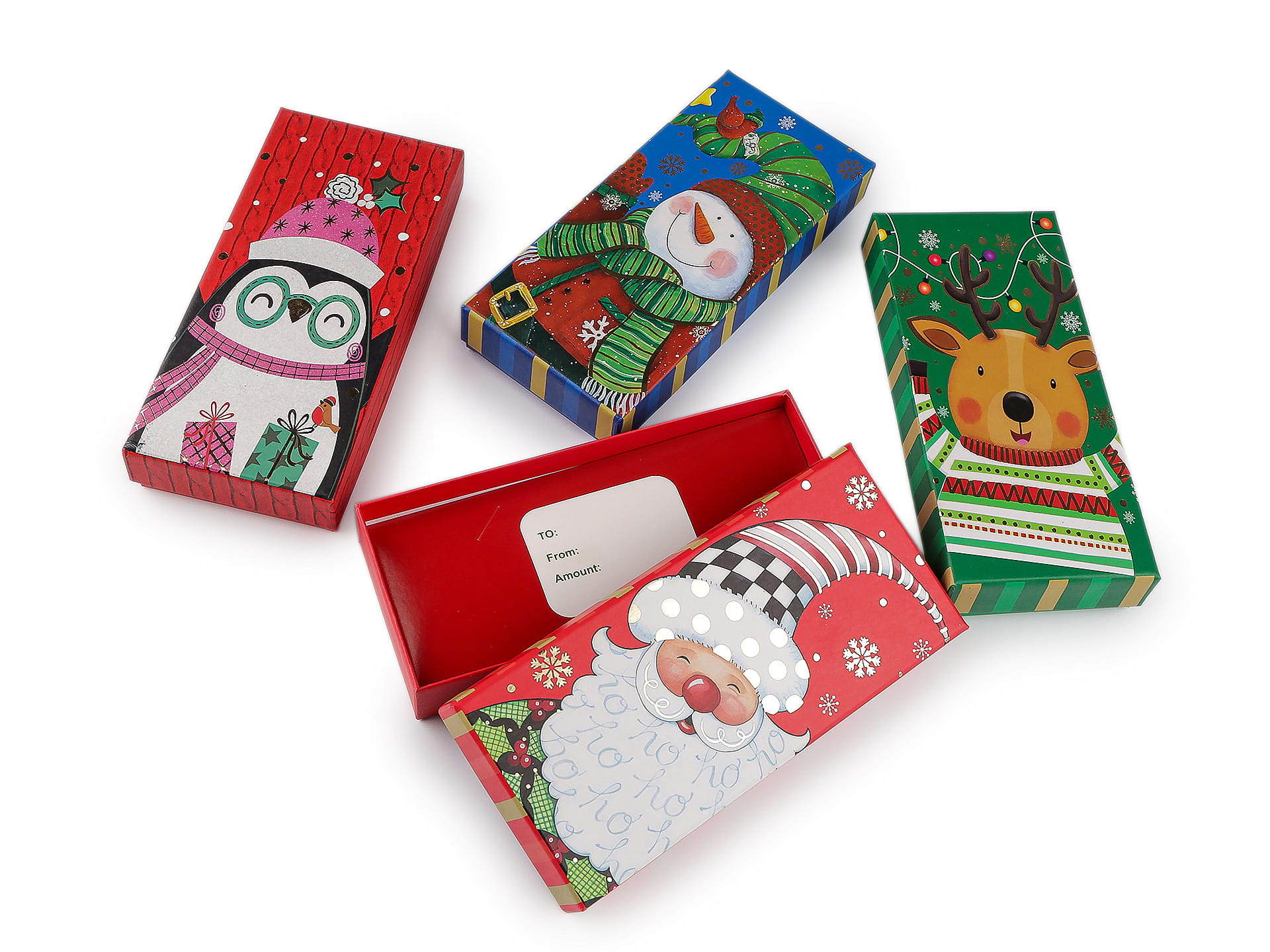 Pudełko ma klasyczną formę z otwieranym wieczkiem. Wewnątrz znajduje się specjalna karteczka do wypisania dedykacji („To, From, Amount”) oraz dwa wycięcia ułożone po przekątnej – ułatwiają one przymocowanie prezentu.