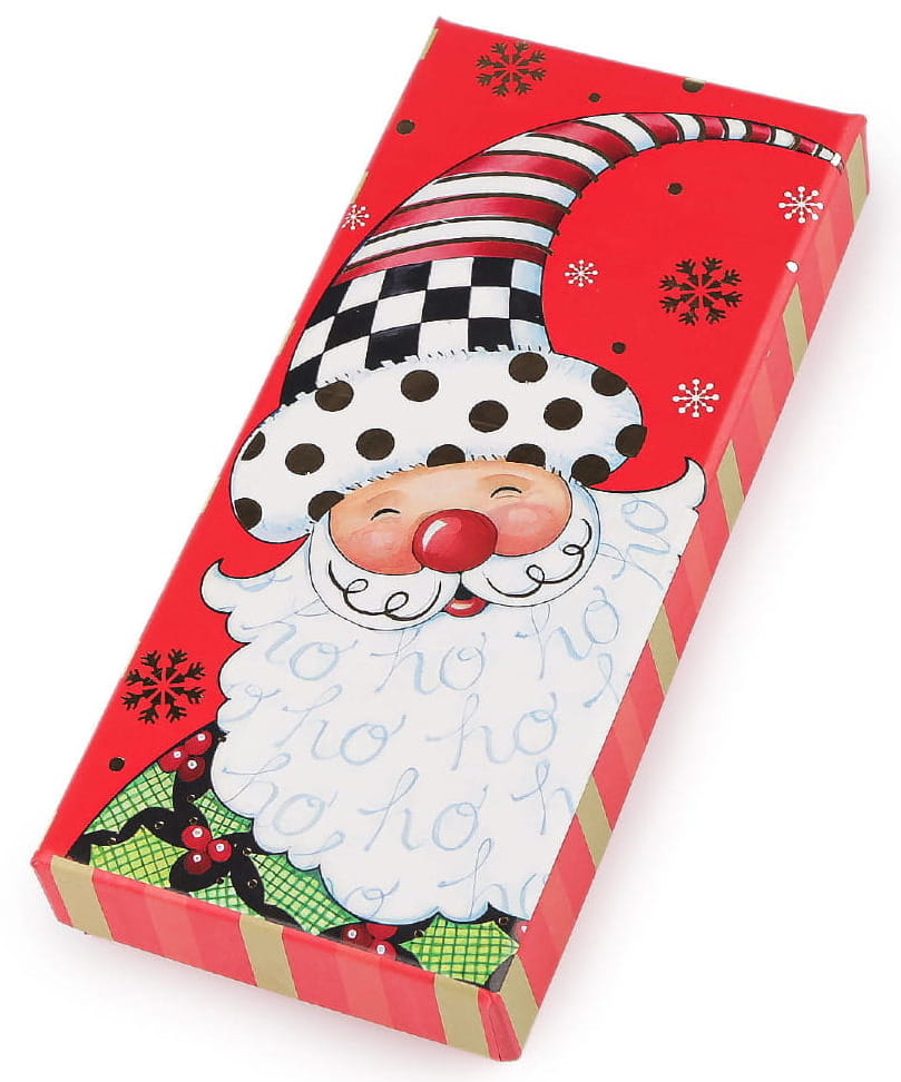 Kolor: czerwony z nadrukiem Mikołaja w czapce w groszki Kształt: prostokątne pudełko z wieczkiem Wymiary: 8 × 17 cm Wysokość: 3 cm Materiał: karton z kolorowym nadrukiem Przeznaczenie: małe, płaskie prezenty, karty podarunkowe, biżuteria