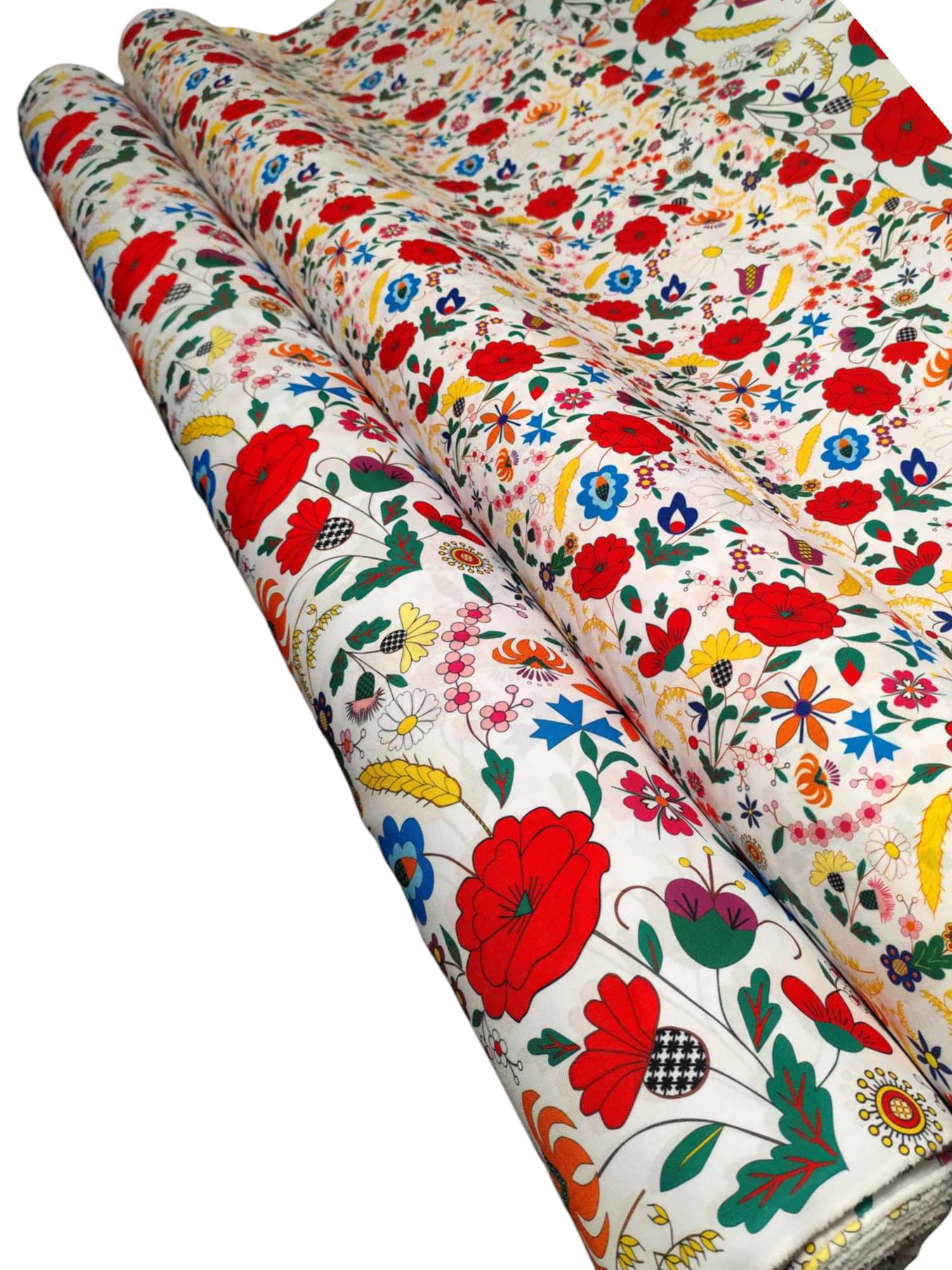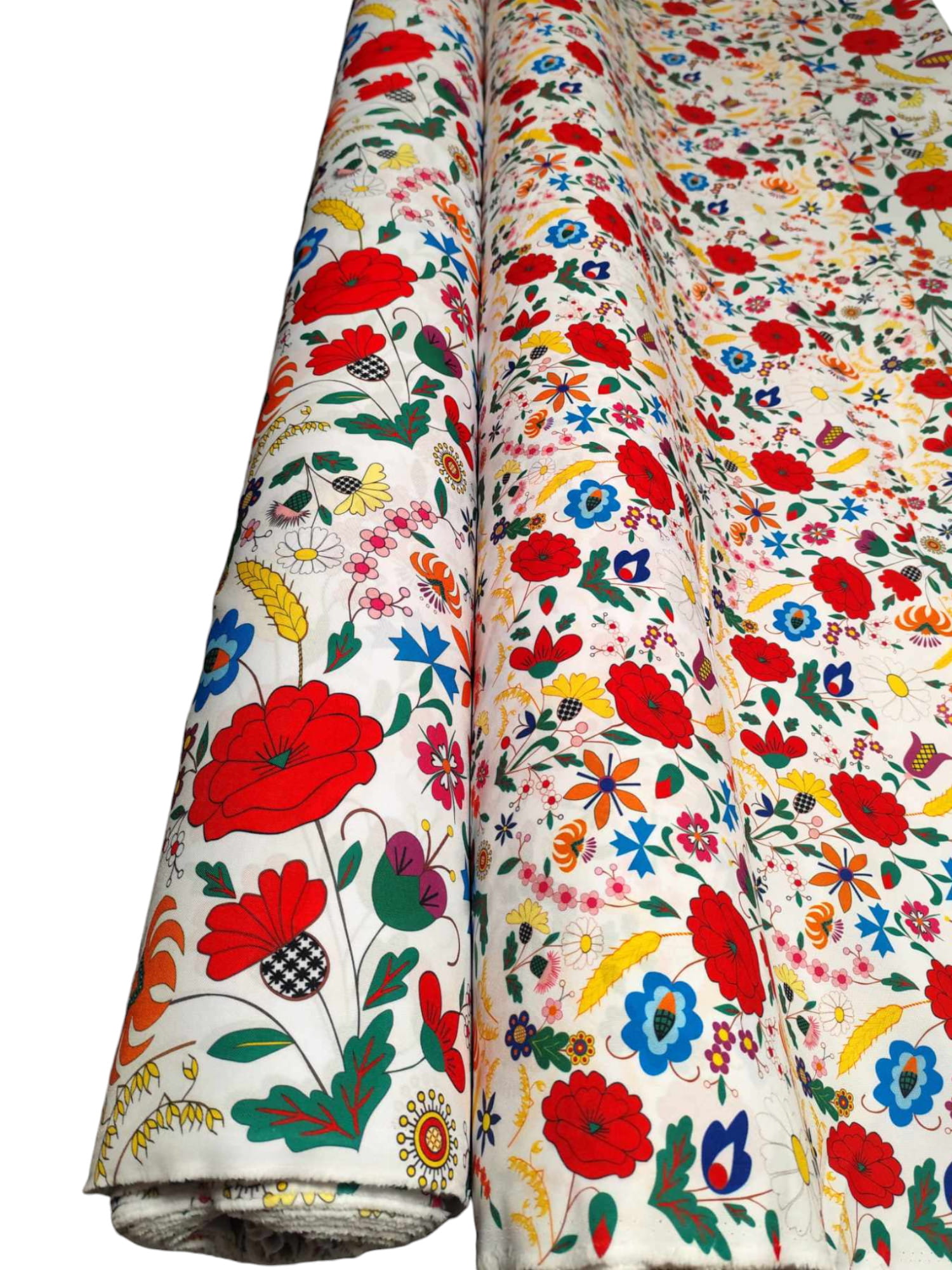 Piękna tkanina z tradycyjnym kociewskim wzorem haftu ludowego na białym tle. Materiał jest idealny do szycia spódnic, fartuszków, ozdób oraz dekoracji dziecięcego pokoju, takich jak worki, poduszki, choinki czy zabawki. Wzór inspirowany jest tradycyjnymi motywami ludowymi z Kociewia, co nadaje mu niepowtarzalnego charakteru.