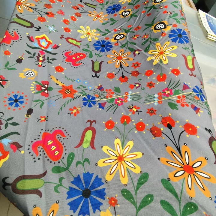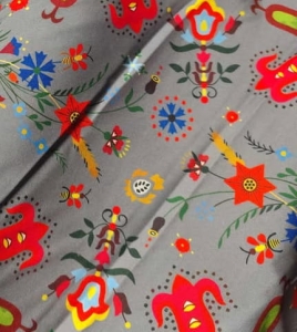 Niezwykła tkanina nawiązuje do bogatego dziedzictwa polskiego folkloru, a w szczególności do tradycyjnych haftów kociewskich. Drobny, wielobarwny wzór na stonowanym, szarym tle sprawia, że materiał ten jest nie tylko dekoracyjny, ale również uniwersalny i elegancki.