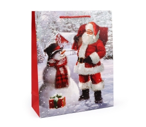 Torba na prezenty świąteczne z motywem Świętego Mikołaja to elegancka i funkcjonalna propozycja, która idealnie sprawdzi się podczas świątecznego okresu. Wykonana z wysokiej jakości, trwałego papieru, gwarantuje wytrzymałość nawet przy większych i cięższych prezentach. Przód torby ozdobiony jest subtelnym brokatem, który nadaje jej wyjątkowy, świąteczny blask, przyciągając wzrok i wprowadzając radosną atmosferę. Uszy torby zostały starannie wykonane z plecionego sznurka, co nie tylko podkreśla jej estetykę, ale także zapewnia wygodę podczas przenoszenia.