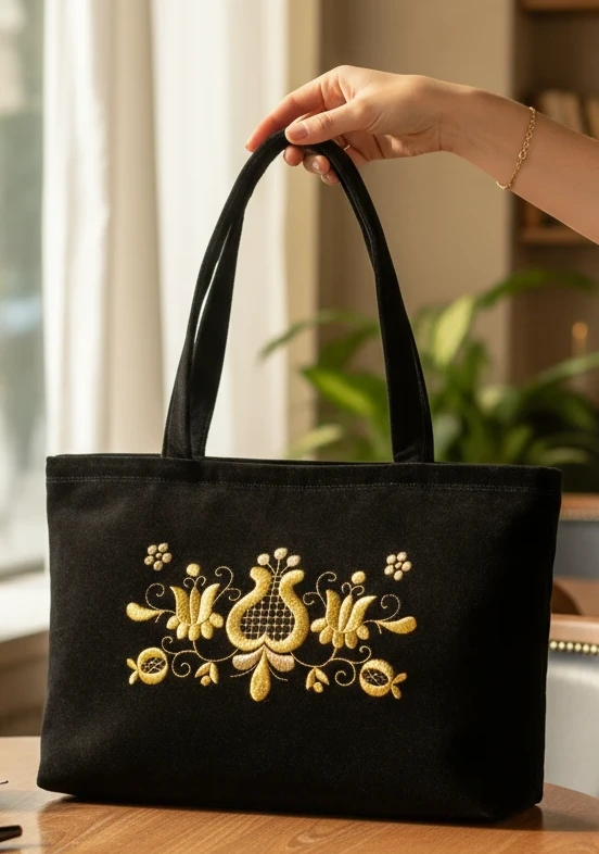 Torebka haftowana na ramię – kaszubski wzór złotniczy