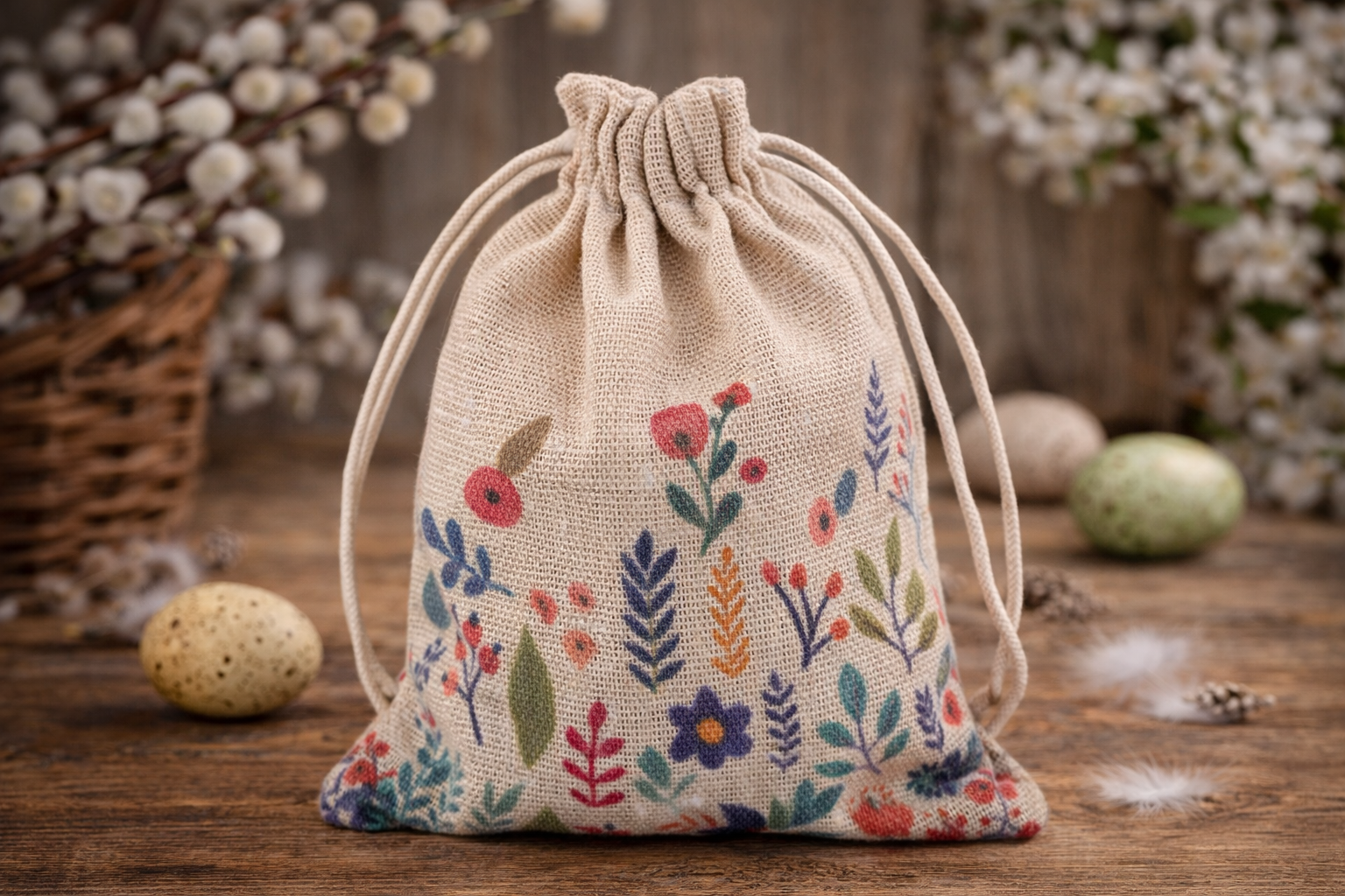 Elegancki i praktyczny woreczek wykonany z wysokiej jakości lnu, ozdobiony uroczym nadrukiem stylizowanych kwiatów. Jego naturalna, lekko rustykalna faktura w połączeniu z delikatnym, pastelowym wzorem nadaje mu subtelnego uroku.