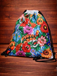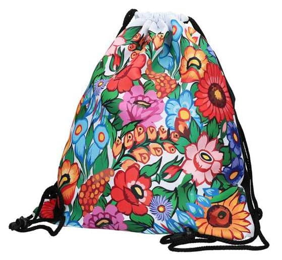 Worek sportowy z nadrukiem inspirowanym tradycyjnymi kwiatowymi zdobieniami z Zalipia to propozycja dla osób ceniących oryginalne wzornictwo z lokalnym charakterem. Przód plecaka zdobi intensywnie kolorowy motyw ludowy, natomiast tył wykonany jest w ciemnej, praktycznej kolorystyce.