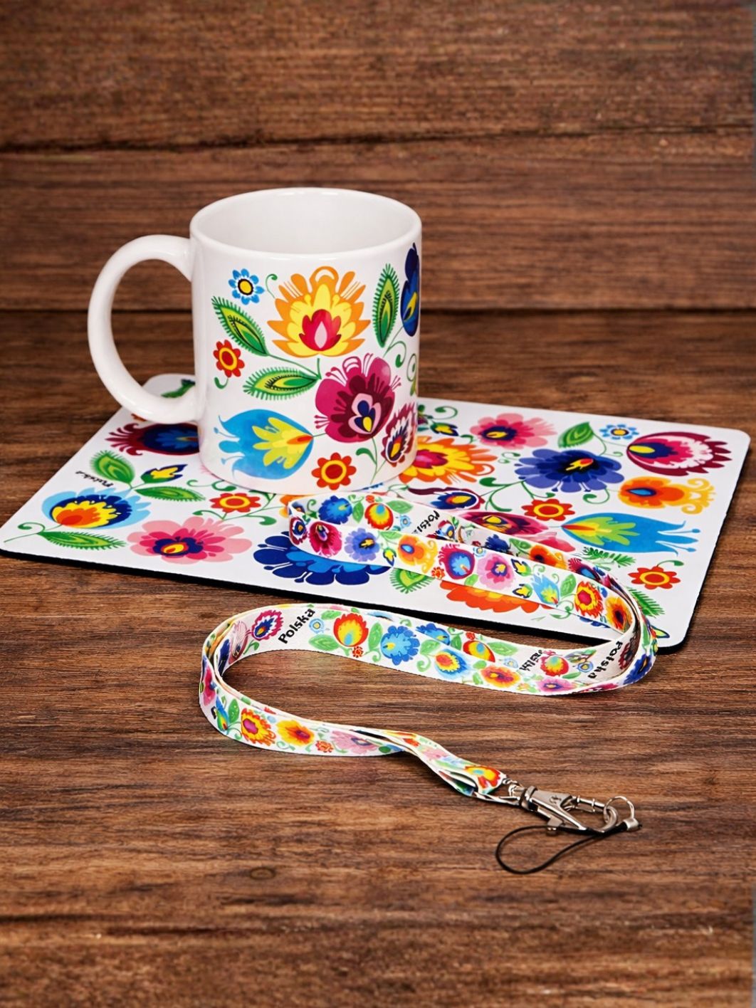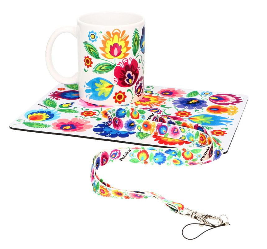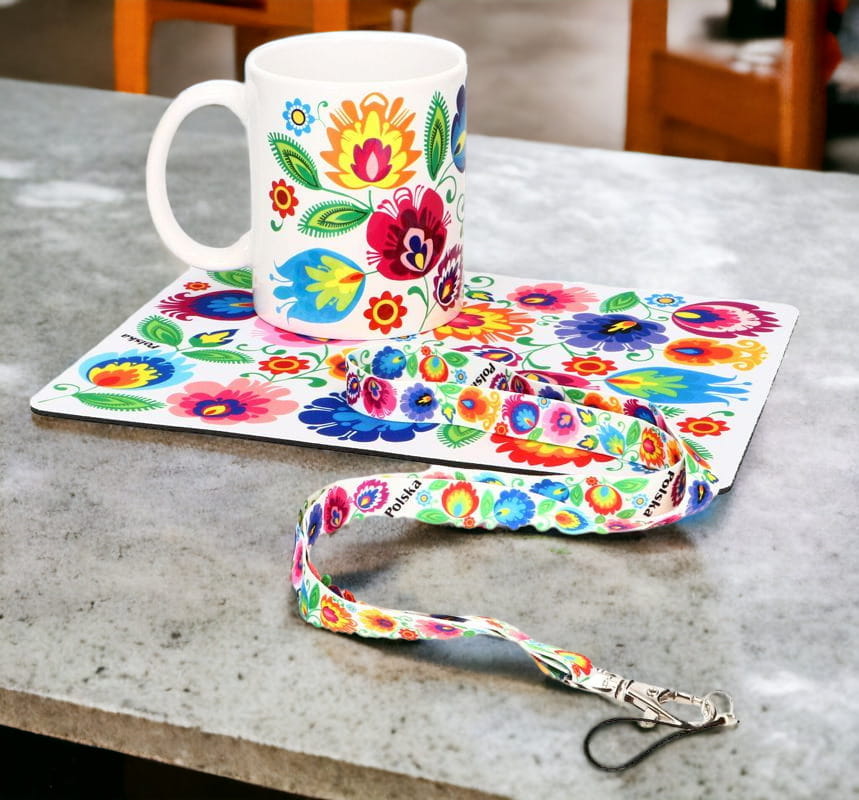 Zestaw folk łowicki to idealna kombinacja praktyczności i polskiego folkloru. Składający się z podkładki pod mysz, kubka folkowego oraz smyczy, zestaw zachwyca swoją wyjątkową ozdobą w postaci tradycyjnych łowickich kwiatów folkowych.